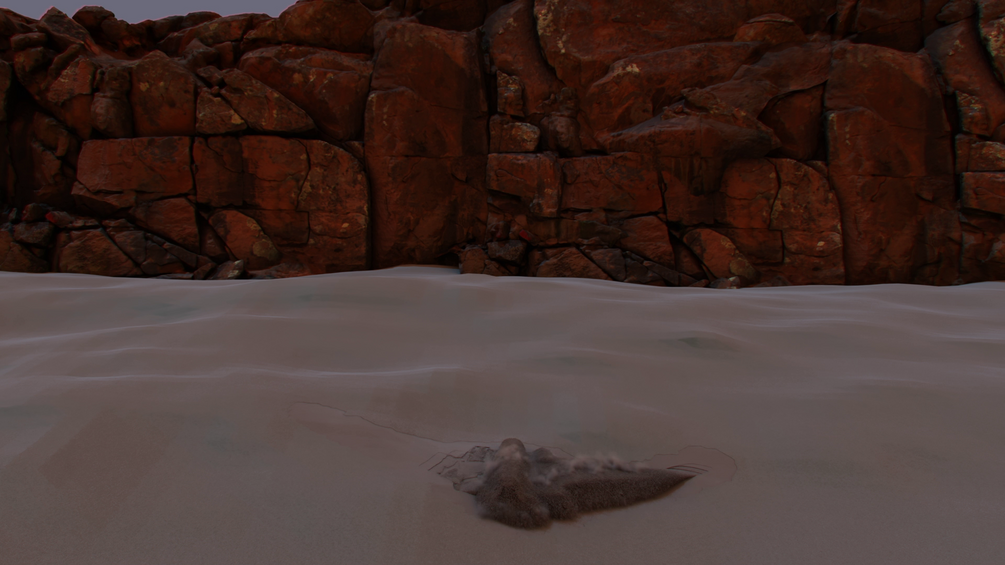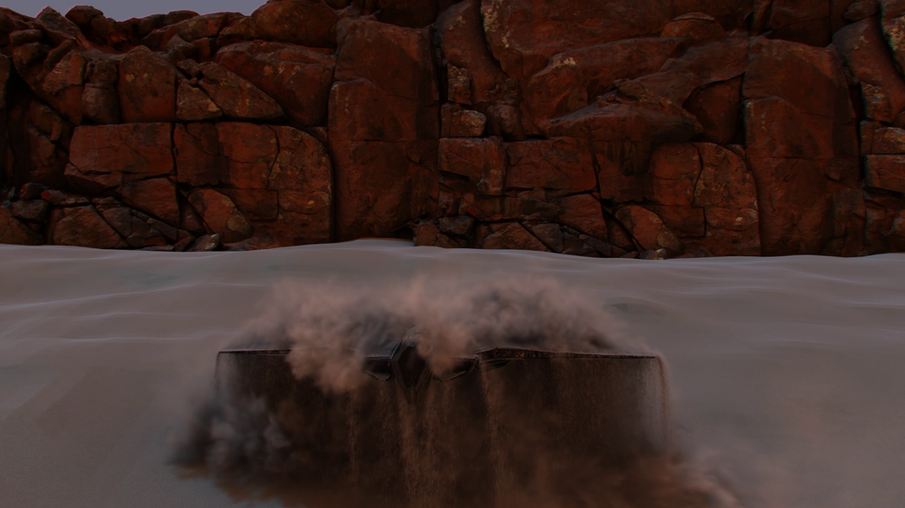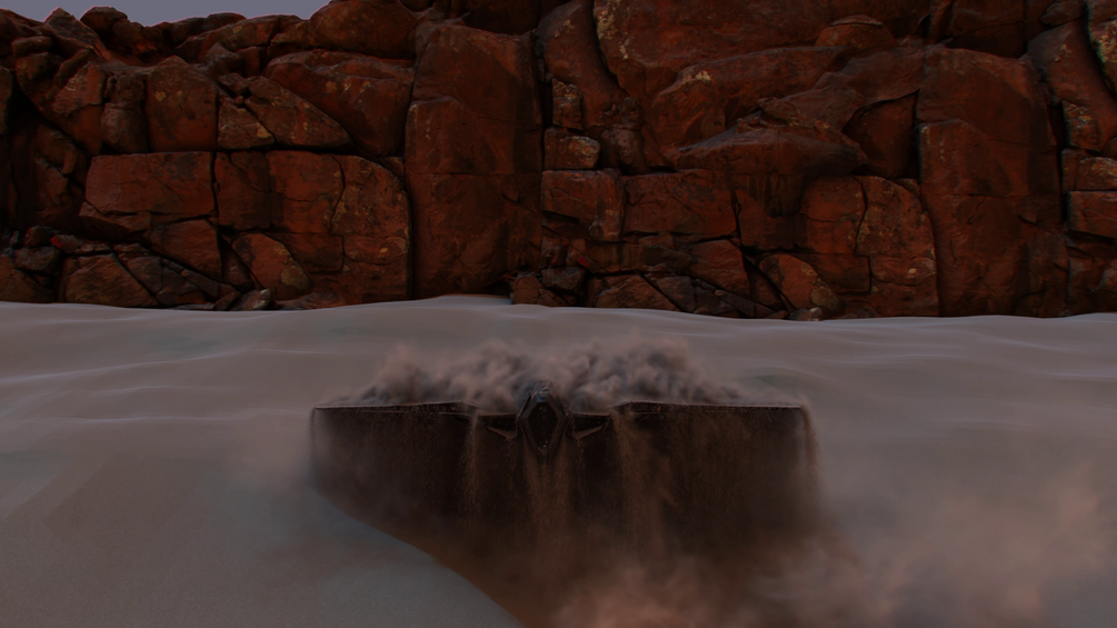 A massive bomber spaceship rises dramatically from a pit of sand, complete with grains and smoke simulations.